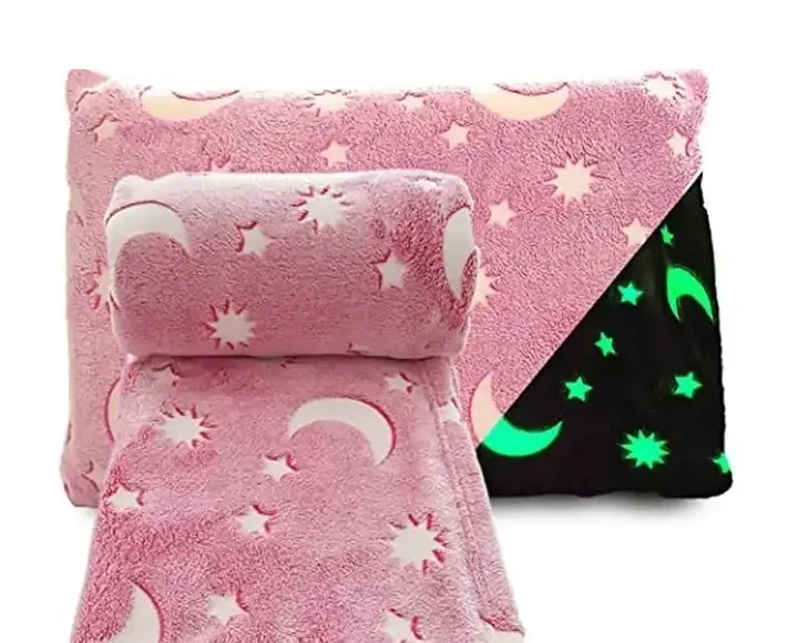 Виконує функцію нічника, дитині не страшно засинати під заспокійливе сяйво зірок. Після зірки поступово меркнуть. Зірки, що світяться, на пледі працюють як накопичувач - у світлий час накопичують частинки світла, а при настанні темряви поступово його віддають